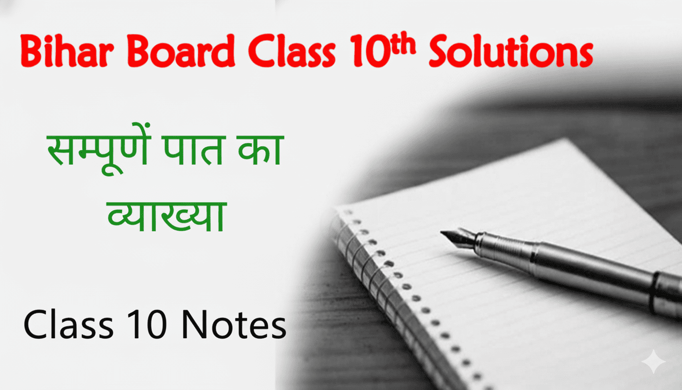 यह नोट्स NCERT तथा SCERT बिहार पाठ्यक्रम पर पूर्ण रूप से आधारित हैं। इस पोस्ट में बिहार बोर्ड कक्षा 10 के सभी विषयों के अध्यायों की हर पंक्ति का हल दिया गया है, जो बोर्ड परीक्षा की दृष्टि से अत्यंत उपयोगी है। इस पोस्ट में दिए गए सभी पाठों को पढ़कर आप मैट्रिक परीक्षा में उच्च अंक प्राप्त कर सकते हैं। यहां दी गई व्याख्याएं पढ़ने से आपका पूरा कॉन्सेप्ट साफ हो जाएगा। सभी नोट्स बोर्ड परीक्षा को ध्यान में रखकर तैयार किए गए हैं। प्रत्येक पाठ को समझना आसान है और इससे आप सभी प्रश्नों के उत्तर आत्मविश्वास के साथ दे सकते हैं। जिस विषय को पढ़ना है, उस पर क्लिक करने से उस पाठ की व्याख्या खुल जाएगी, जहाँ हर पंक्ति का अर्थ दिया गया है।